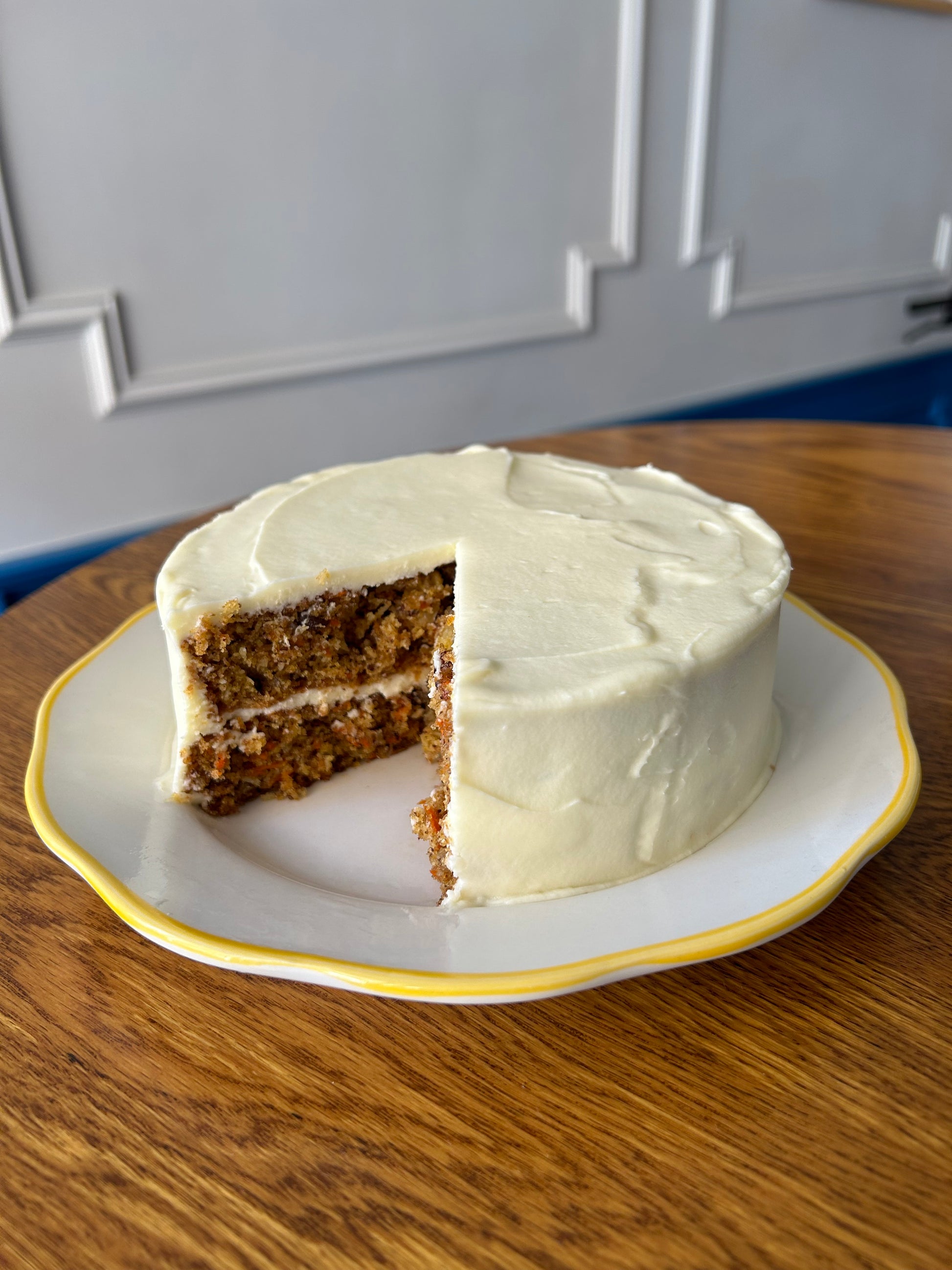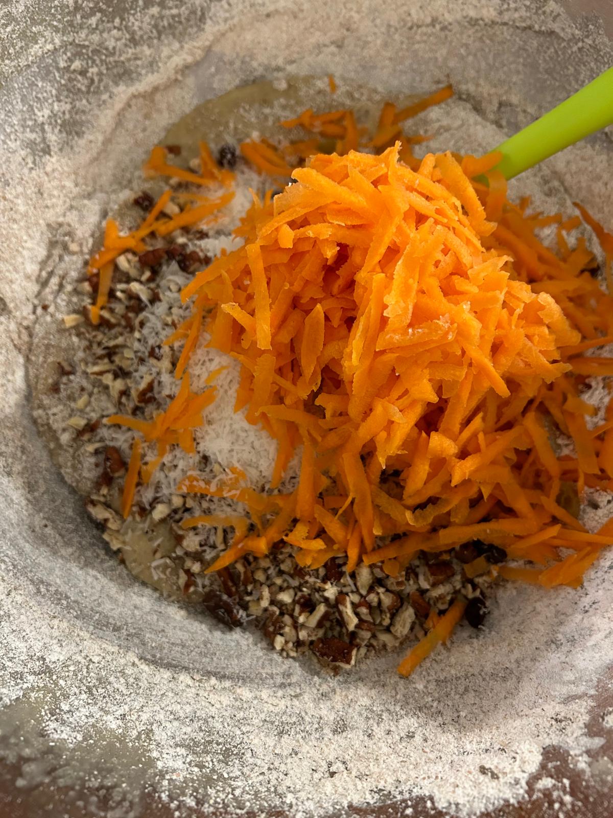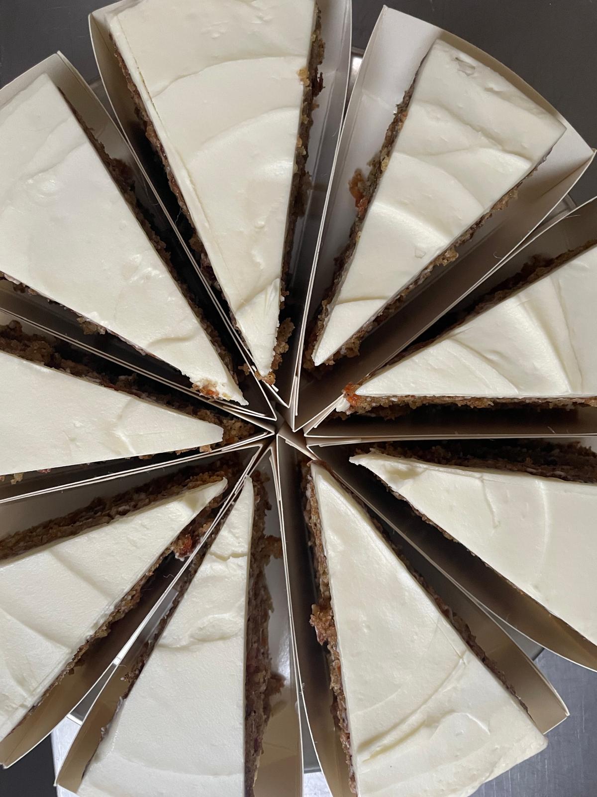 Grated carrots, shredded coconut, golden raisins, wholegrain rye flour, wholegrain pastry flour, cream cheese frosting