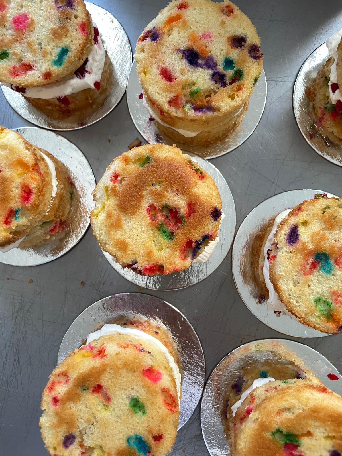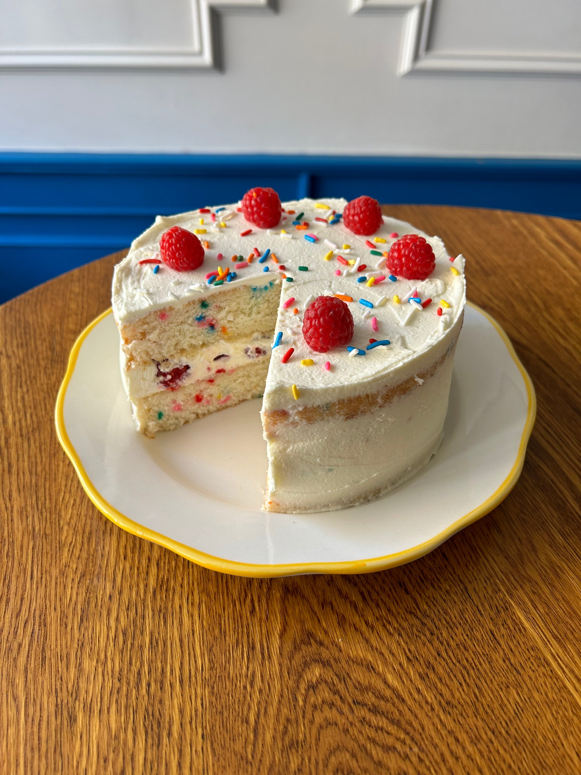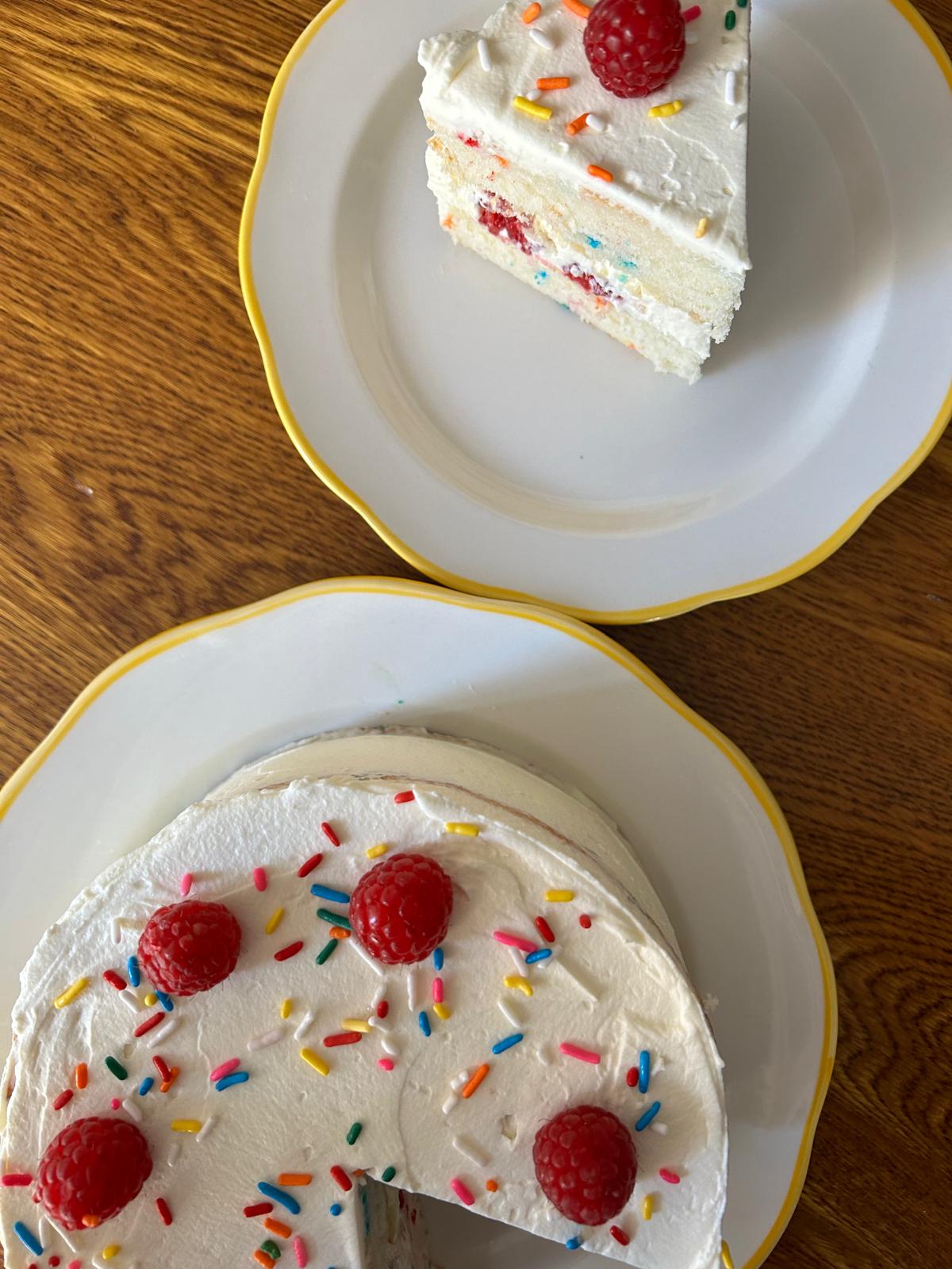 Vanilla cake with sprinkles, fresh raspberries, whipped vanilla ganache.