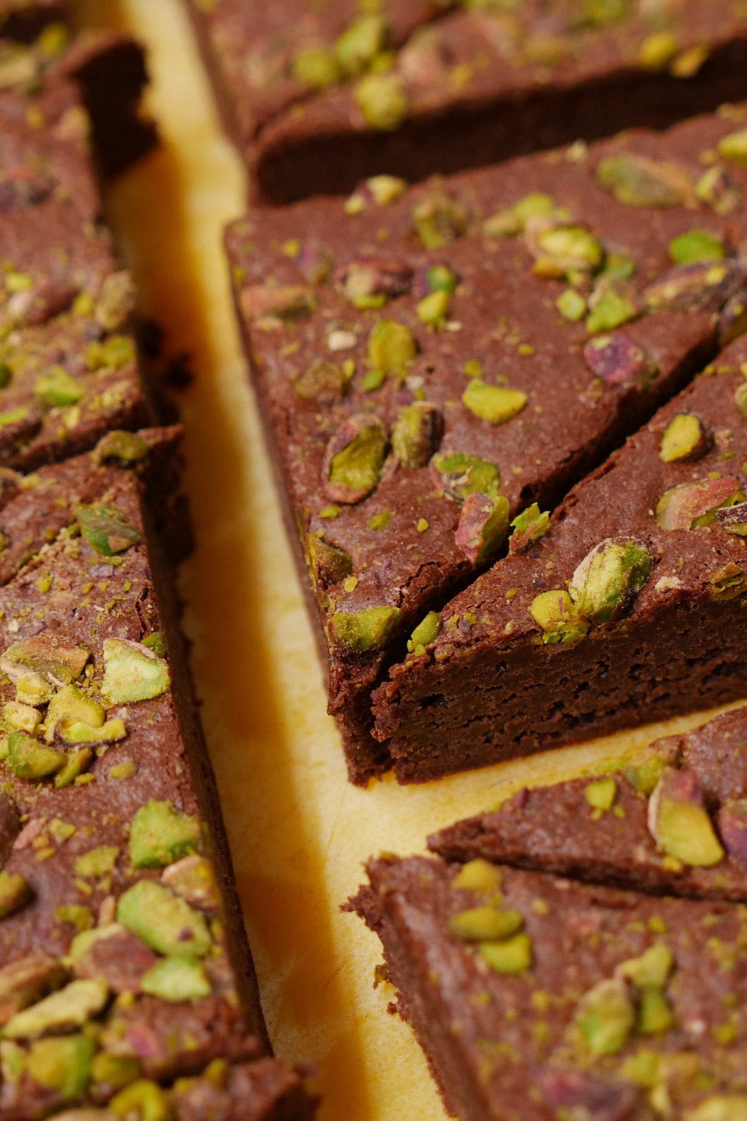 16 pistachio brownies. A super chocolatey brownie liberally covered in pistachios for crunch and flavor.